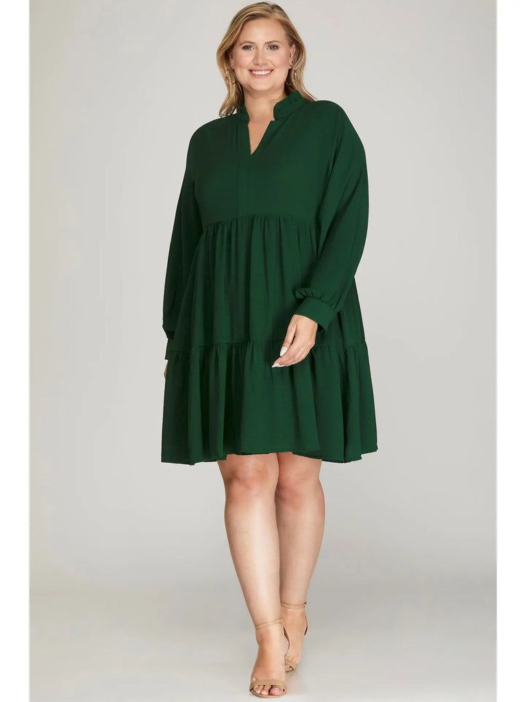 Plus Long Sleeve Woven Tiered Dress || Green